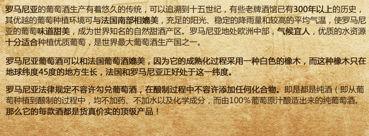 罗马尼亚是旧世界葡萄酒生产国之一,有着悠久的葡萄酒酿造传统,传说中的酒神狄厄尼索斯就降生在罗马尼亚的Thracia,因为酒神的光顾,罗马尼亚便成为世界上生产好酒的国度之一。同时,世界第四大葡萄酒生产国的身份,也让罗马尼亚在国际葡萄酒生产国中占据了重要一席。在世界葡萄酒纷纷转向中国市场的时候,罗马尼亚的葡萄酒也紧随法国、西班牙、意大利、德国、智利等国家的脚步,开始了向中国市场的“运动”。因为罗马尼亚优越的地理位置和气候条件,其所生产的葡萄酒品质优良,在罗马尼亚葡萄酒向中国市场转向之后,有人对此形容说:罗马尼亚的一滴好酒,已来到了中国。