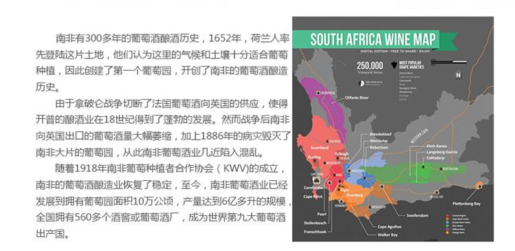 在北开普敦,奥兰治河是绿洲的源泉。酒体呈深紫红色,中度至重度酒体。酒香扑鼻,散发出迷人的辛香气息,入口饱满,带有浓郁的黑莓及洋李的味道。